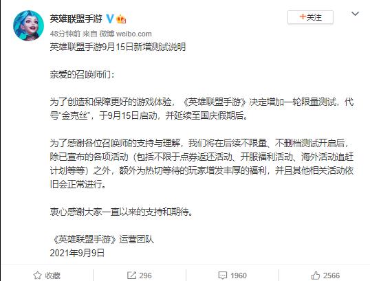但是在今日上午《英雄联盟手游》官方发布,为了创造和保障更好的游戏体验,《英雄联盟手游》决定增加一轮限量测试,代号 " 金克丝 ",于 9 月 15 日启动,并延续至国庆假期后