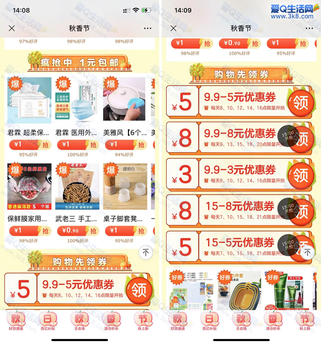 再下拉就可以三点去抢一个9.9-8元的券,下面有很多都是9.9的东西,用完券就是一块多了