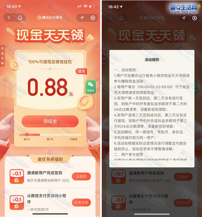 这个活动其实很简单,只要在腾讯出行服务小程序中连续签到三天就可领取微信红包中间不能断